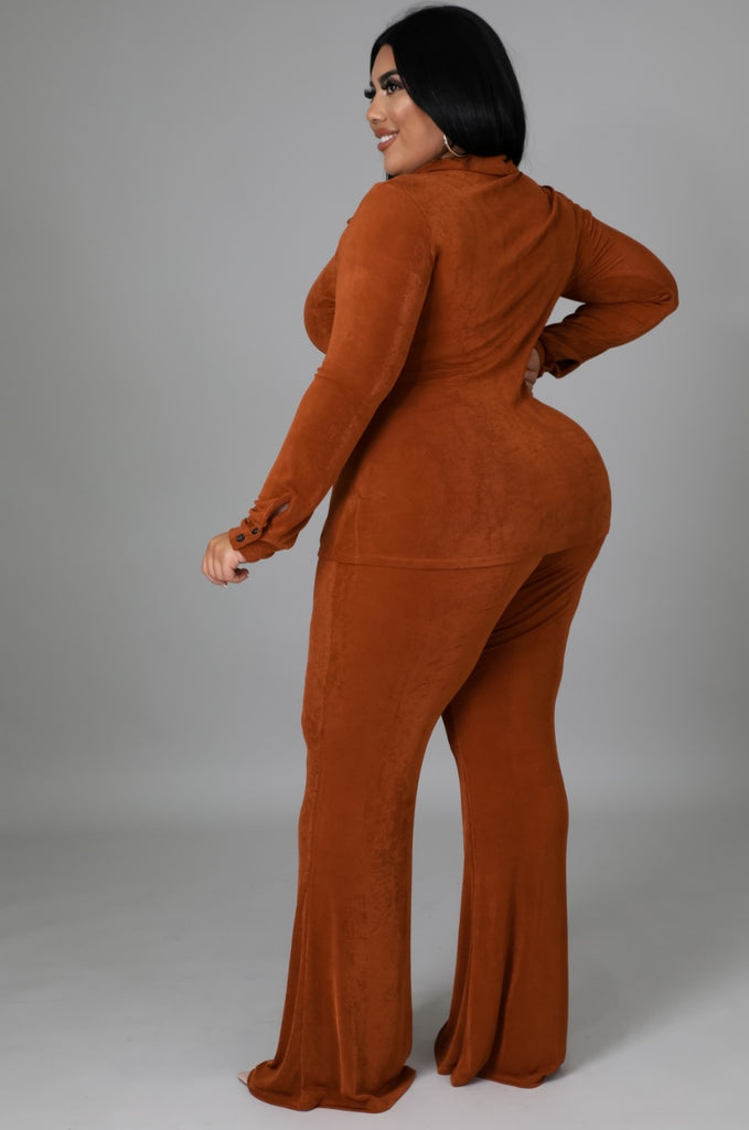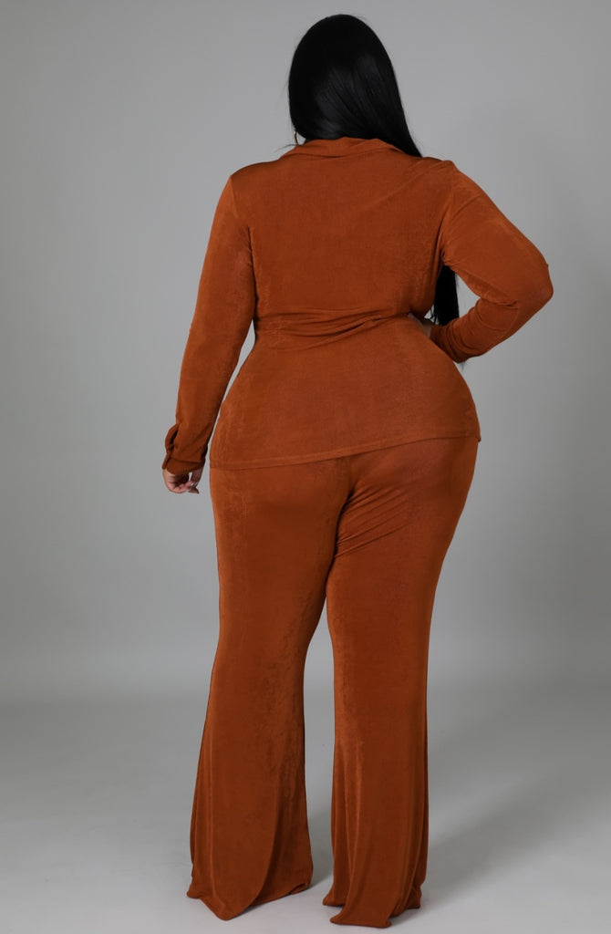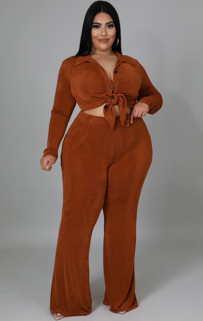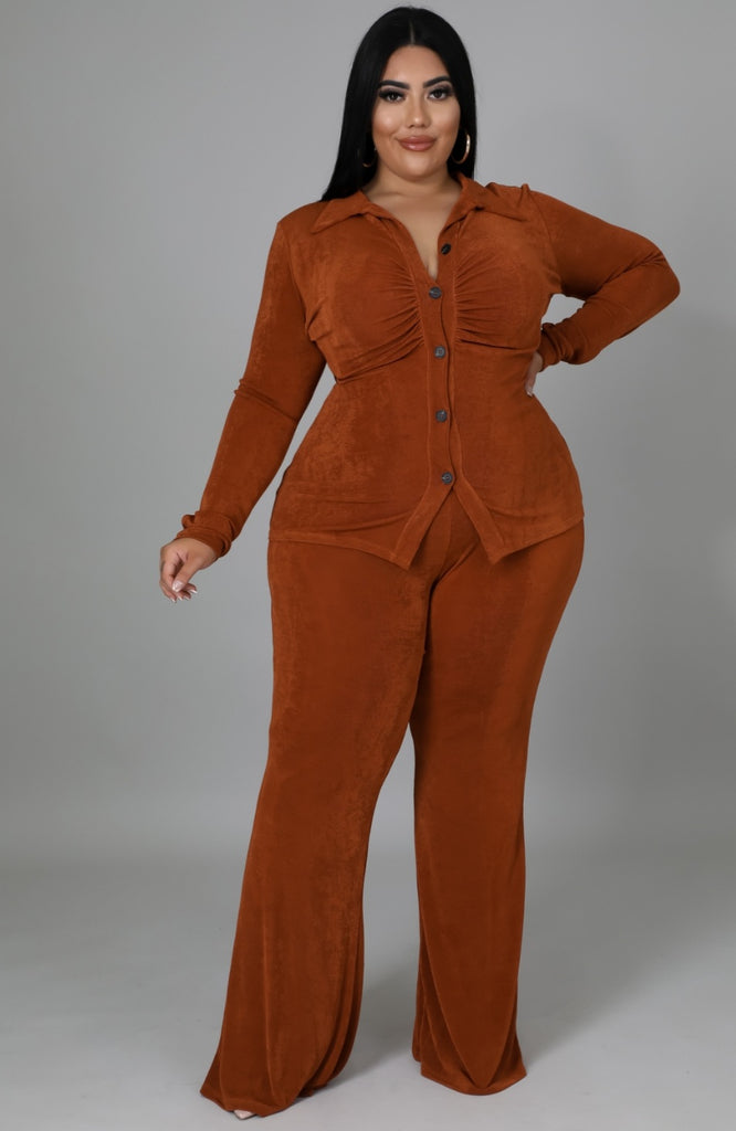 Congac color two piece set Stretch top Collar Long sleeves Ruched Button closure High waisted pants Elastic waistband Wide legs No closure 95% polyester 5% spandex Hand wash cold Model is wearing a 2X